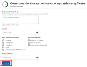 Na koniec należy jeszcze raz powtórzyć utworzone hasło, a potem kliknąć „Generuj”. Klucz prywatny zostanie automatycznie zapisany na Twoim urządzeniu jako plik z rozszerzeniem „.key”.