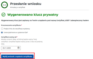 Po uzupełnieniu powyższych informacji wybierz opcję „Wyślij wniosek o wydanie certyfikatu”.
