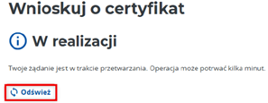 4. Pojawi się komunikat, iż operacja jest w realizacji. Możesz wybrać przycisk „Odśwież”, aby sprawdzić, czy certyfikat został wydany.