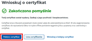 5. Po otrzymaniu komunikatu, że certyfikat został wydany, możesz kliknąć przycisk „Pobierz certyfikat”, aby zapisać go na urządzeniu w formacie PEM z rozszerzeniem „.crt”.