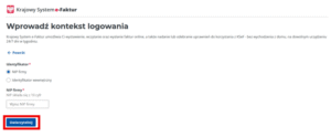 Następnie wprowadź kontekst logowania, aby uwierzytelnić się w systemie. Wybierz rodzaj identyfikatora (NIP firmy lub identyfikator wewnętrzny), a potem podaj NIP firmy.