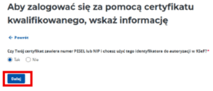 Jeśli logujesz się za pomocą certyfikatu kwalifikowanego konieczne będzie wskazanie, czy certyfikat, którym się uwierzytelniasz jest podpisem z numerem NIP lub PESEL, następnie wybierz „Dalej”.
