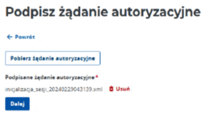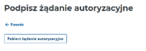 W dalszej części należy pobrać żądanie autoryzacyjne na dysk komputera klikając „Pobierz żądanie autoryzacyjne”. Pobrane żądanie należy podpisać podpisem kwalifikowanym bądź pieczęcią kwalifikowaną.