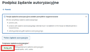 Następnie należy dodać podpisane żądanie autoryzacyjne klikając „Dodaj plik” i wybrać podpisany plik