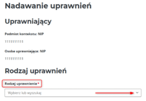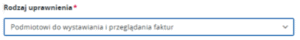 W sekcji „Rodzaj uprawnienia” z listy rozwijanej wybierz opcję „Podmiotowi do wystawiania i przeglądania faktur”.
