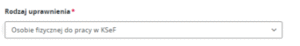 W sekcji „Rodzaj uprawnienia” z listy rozwijanej wybierz opcję „Osobie fizycznej do pracy w KSeF”.