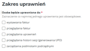 W dalszej części w sekcji „Zakres uprawnień” wybierz w jakim celu upoważniasz osobę: do wystawiania faktur i/lub do przeglądania faktur (konieczne jest wybranie co najmniej jednej opcji).