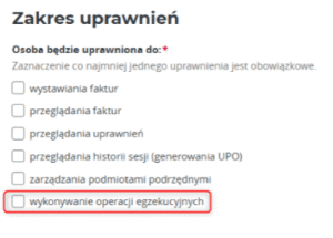 2. Zakres uprawniania – zawęża listę uprawnień do wybranego zakresu: zarządzanie uprawnieniami, przeglądanie uprawnień, wystawianie faktur, przeglądanie faktur, przeglądanie historii sesji, zarządzanie jednostkami podrzędnymi, operacje egzekucyjne;