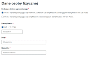• osoba fizyczna posługująca się Profilem Zaufanym lub certyfikatem zawierającym identyfikator NIP lub PESEL