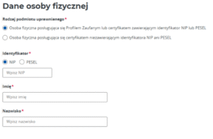 Po wybraniu tej opcji, zaznacz rodzaj identyfikatora (NIP lub PESEL), a następnie podaj numer wybranego rodzaju identyfikatora. Dalej uzupełnij imię i nazwisko osoby uprawnianej.