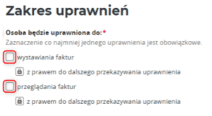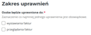 Potem zaznacz zakres uprawnień: do wystawiania faktur i/lub do przeglądania faktur (konieczne jest wybranie co najmniej jednej opcji).