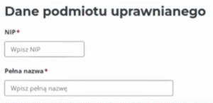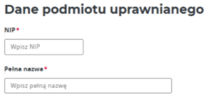 Rozwinie się dalsza część formularza, w której będzie należało uzupełnić dane podmiotu uprawnionego takie jak: NIP oraz pełna nazwa.