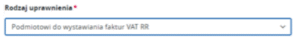 W sekcji „Rodzaj uprawnienia” z listy rozwijanej wybierz opcję „Podmiotowi do wystawiania faktur VAT RR”.