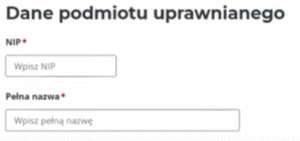 Rozwinie się dalsza część formularza, w której będzie należało uzupełnić dane podmiotu uprawnianego, takie jak NIP oraz pełna nazwa.