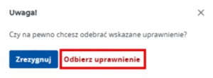 Aby potwierdzić czynność, wybierz „Odbierz uprawnienie”. Jeśli wybierzesz opcję „Zrezygnuj”, uprawnienie zostanie aktywne.