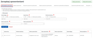 Wyświetlona tabela, oprócz powyższej kolumny, zawiera także informacje o jednostce podrzędnej [2], podmiocie uprawnionym [3], zakresie uprawnienia [4] , opisie uprawnienia [5], podmiocie uprawniającym [6] oraz datę początkową [7].