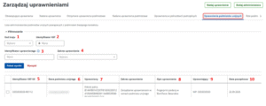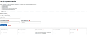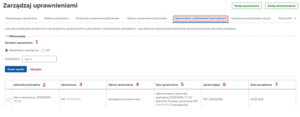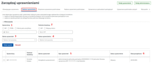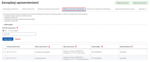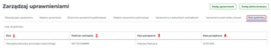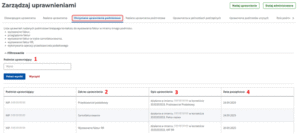 Wyświetlona tabela, oprócz powyższej kolumny, zawiera także informacje o zakresie uprawnień [2], opis uprawnień [3], dane podmiotu uprawniającego [4] oraz datę początkową [5].