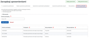 • podmiot uwierzytelniony dysponuje uprawnieniem do: zarządzania uprawnieniami lub przeglądania uprawnień lub zarządzania jednostkami podrzędnymi.