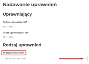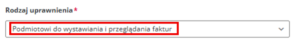 W sekcji „Rodzaj uprawnienia” z listy rozwijanej wybierz opcję „Podmiotowi do wystawiania i przeglądania faktur”.
