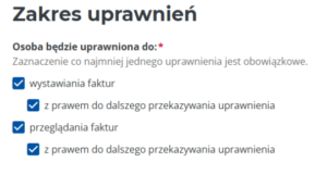 W dalszej części pojawi się sekcja „Zakres uprawnień”, w której należy zaznaczyć oba uprawnienia (do wystawiania faktur i do przeglądania faktur).