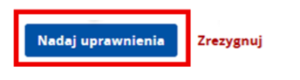 System przewiduje także możliwość rezygnacji z nadawania uprawnień, w tym celu wybierz „Zrezygnuj” – spowoduje to wyświetlenie poniższego komunikatu:
